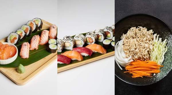 5 Futomakis, 3 sashimis de salmón, 4 nigiris de salmón braseado y 4 maki de aguacate