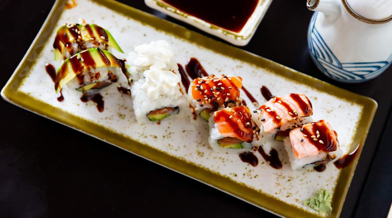 Langostino furai, nori, aguacate, queso crema cubierta de aguacate y salsa acevichada