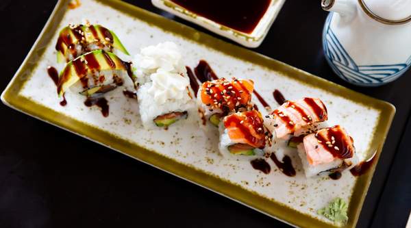 Langostino furai, nori, aguacate, queso crema tempurizado en panko con salsa de anguila