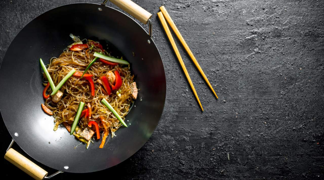 Tallarines de Arroz salteados con verduras, cebolla ,cacahuete, tofu, gambas, pollo, huevo, nabo y ajo (picante)
