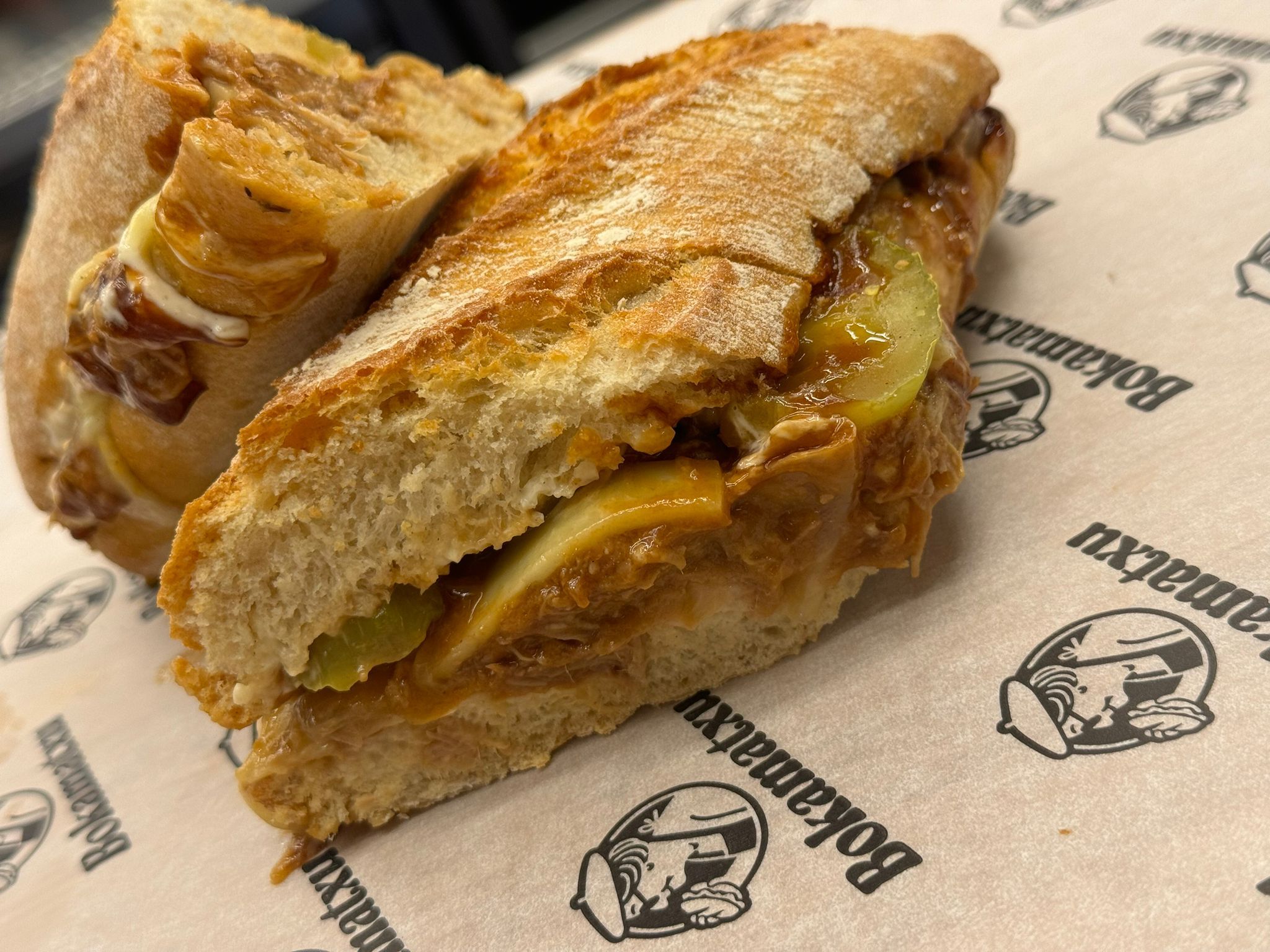 Pulled pork salsa BBQ, monterrey Jack, pepinillos laminados, cebolla pochada, salsa ranchera y pan de txapata