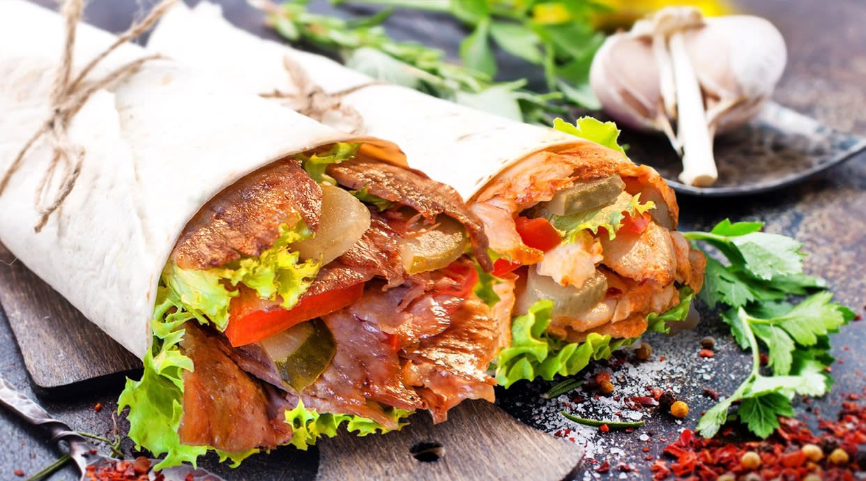 Carne de ternera y pollo en pan crujiente turco, acompañado de lechuga, tomate, cebolla y nuestras sabrosas salsas
