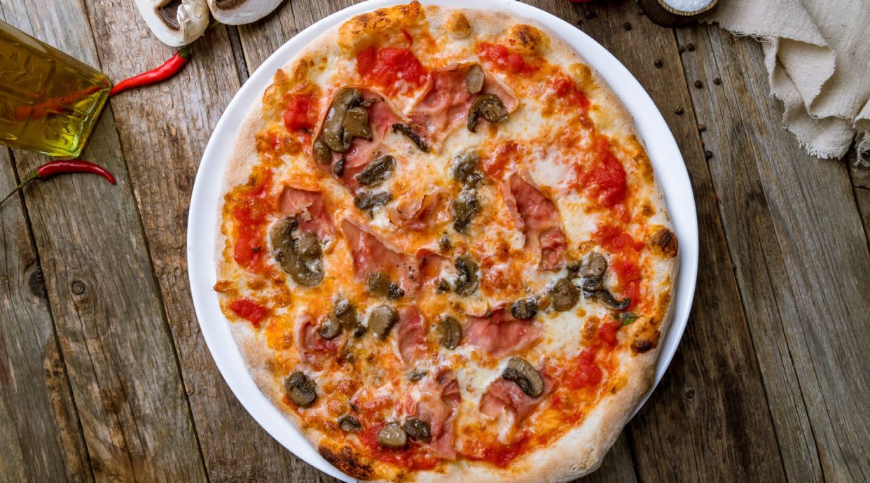 Con tomate, mozzarella, jamón cocido, champiñón, huevo escalfado, gambas, aceitunas negras y orégano