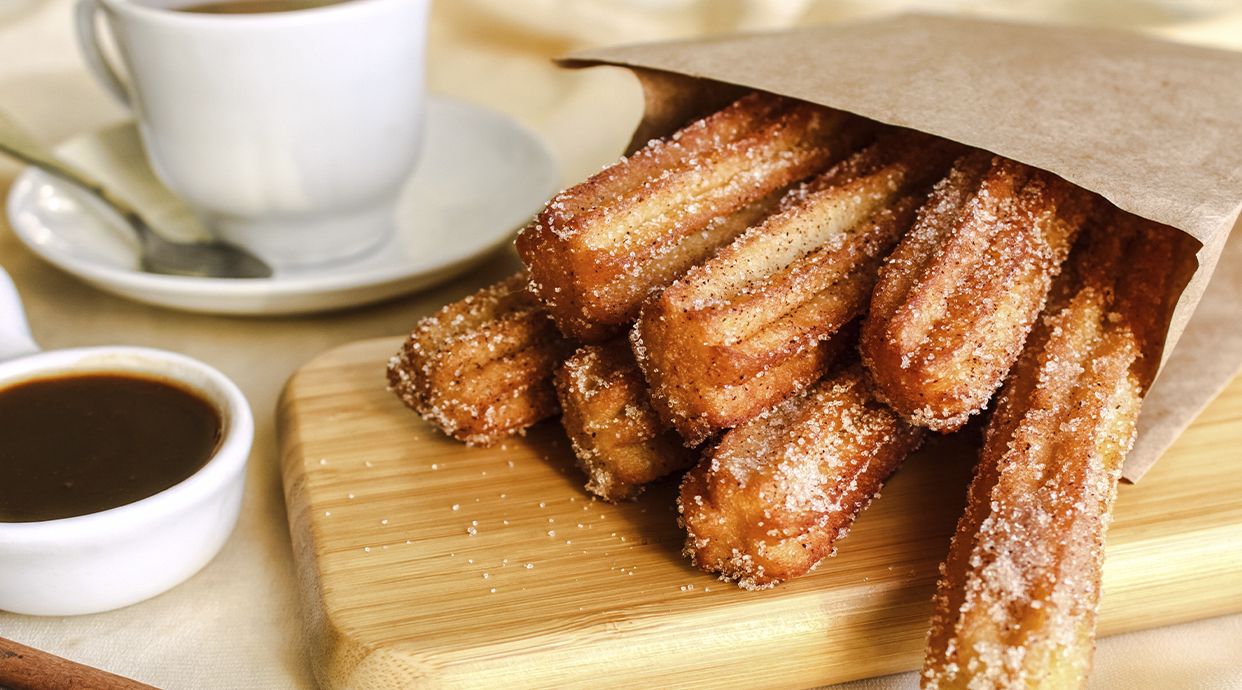 Tradicionales churros crujientes de masa frita, espolvoreados con azúcar