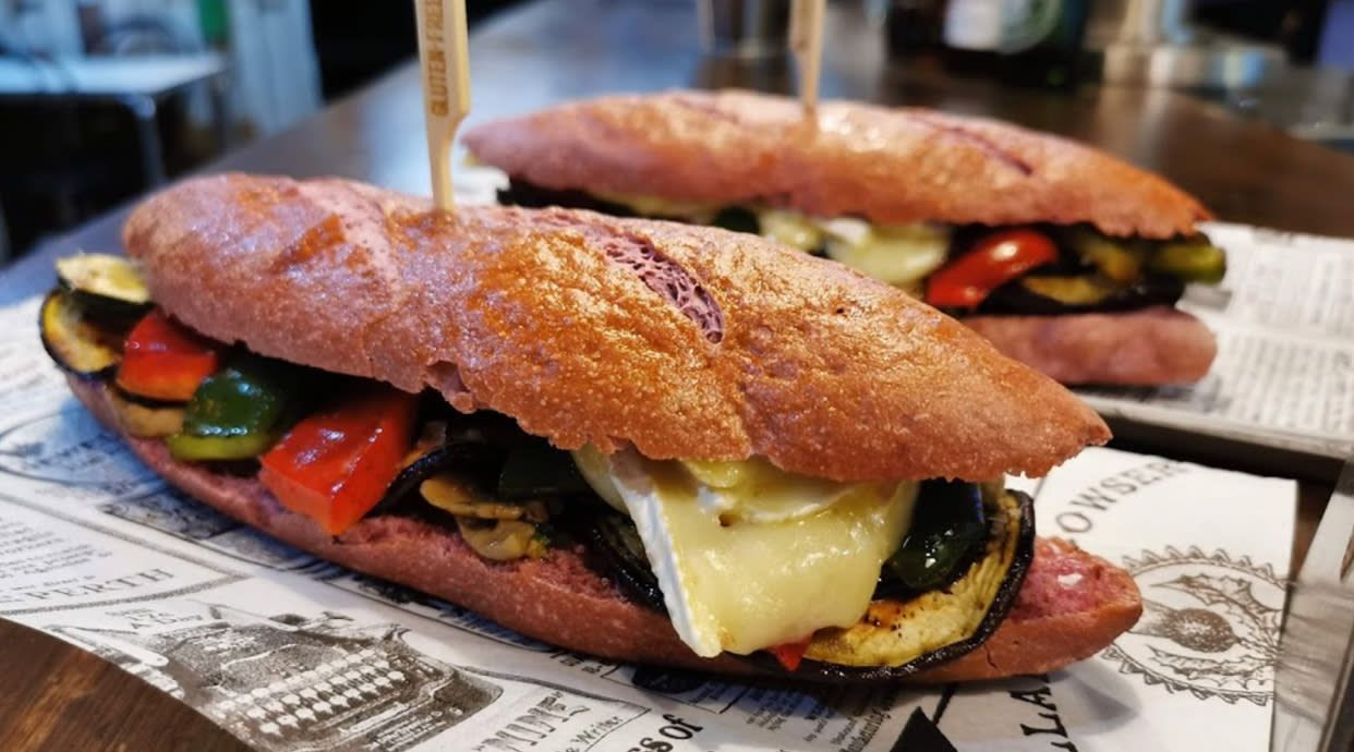 En pan de Remolacha, Calabacin, Berengena, Pimientos (todos a la Plancha) Setas salteadas y queso Brie.