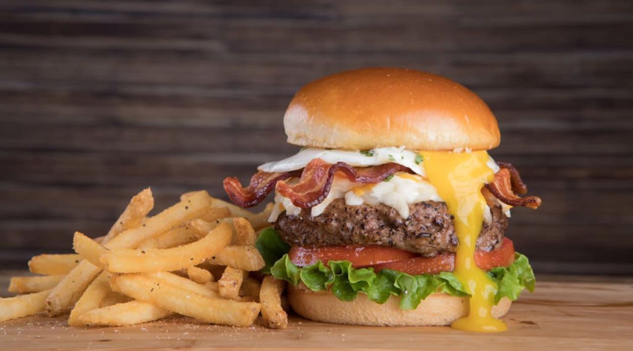 Pan rústico, carne 100% vacuno (110 g.), salsas, jamón, queso, bacon, huevo y ensalada