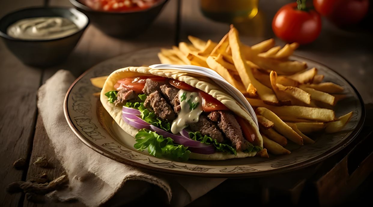 Hamburguesa de ternera y cordero, tomate, lechuga, cebolla, tirokafteri y queso