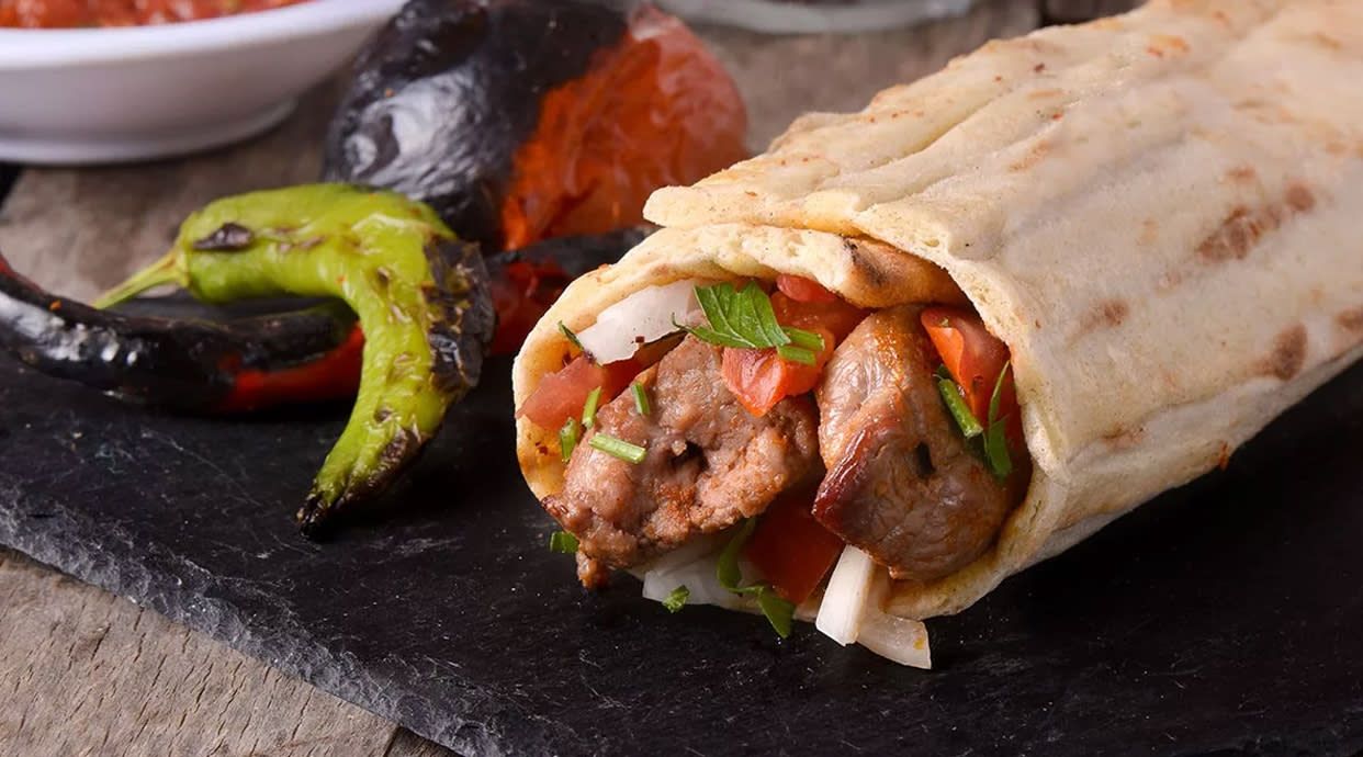 Pan fino enrollado con carne picada y especias turca a la parrilla, ensalada, pimiento, cebolla asada y salsa