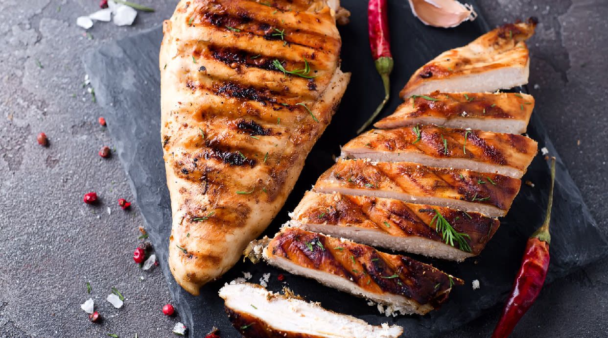 Pollo asado, aguacate, pimiento y tomate natural