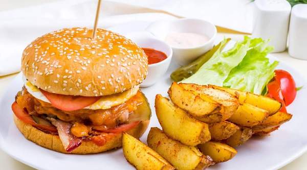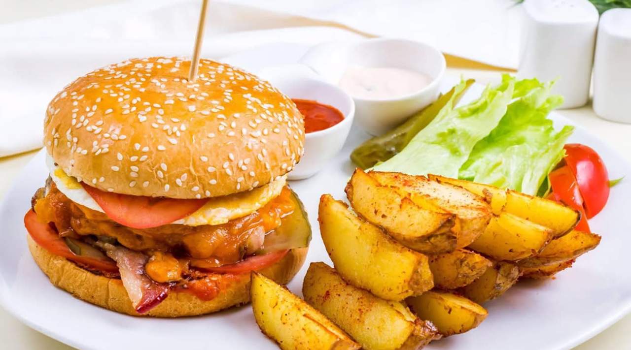 Carne de novillo americano raza Wagyu 100%, rúcula, tomate, queso de cabra, cebolla caramelizada, salsa Bourgy y acompañada de patatas fritas teja.