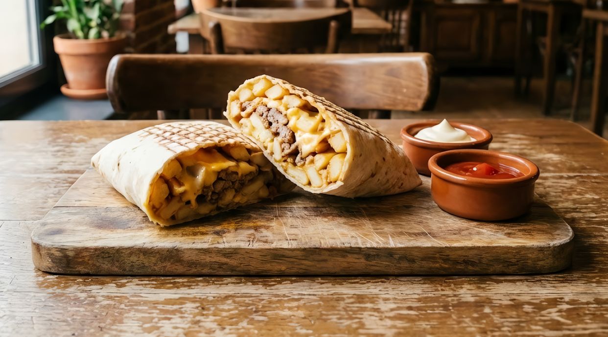 Ternera, patatas crujientes, salsa andaluz y queso fundido