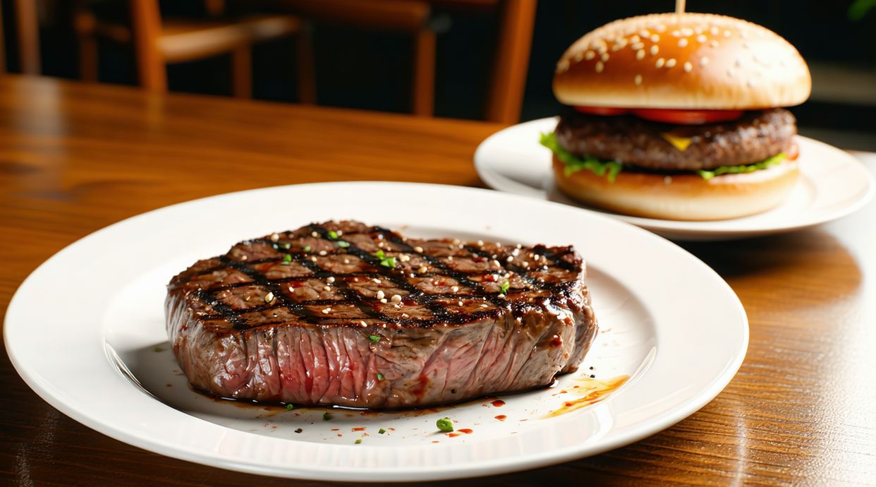 Filete de ternera con lechuga, tomate, cebolla y patatas