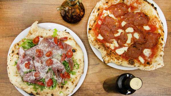 Espinacas, mozzarella, gorgonzola, nduja ,miel y nueces
