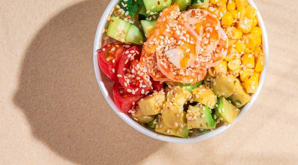 Arroz sushi .Salmon cocido , surimi con mayo japonés. Edmame ,Insalda mix ,mango , sésamo .salsa teriyaki