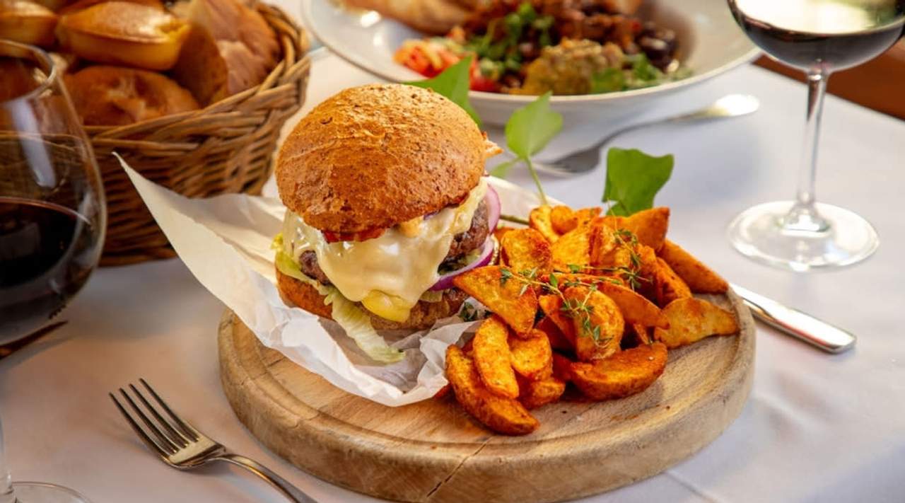 Vaca vieja gallega con 30 días de maduración (180 g.), jamón de pata negra, queso de cabra, rúcula, cebolla caramelizada, salsa barbacoa, pan de brioche y patatas Puente Viejo con tus 2 salsas favoritas
