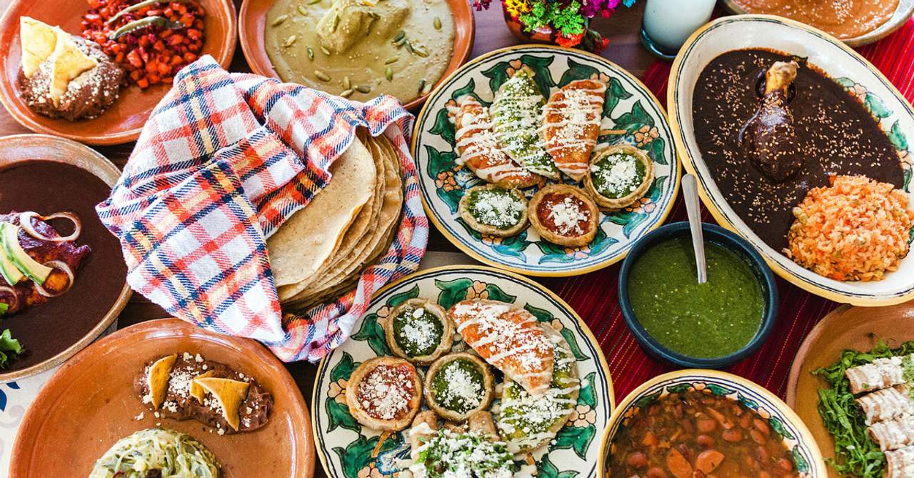 Tortillas de maíz fritas, untadas de frijoles, carne, pollo o mixtos, cebolla desflemada, tomate y guacamole