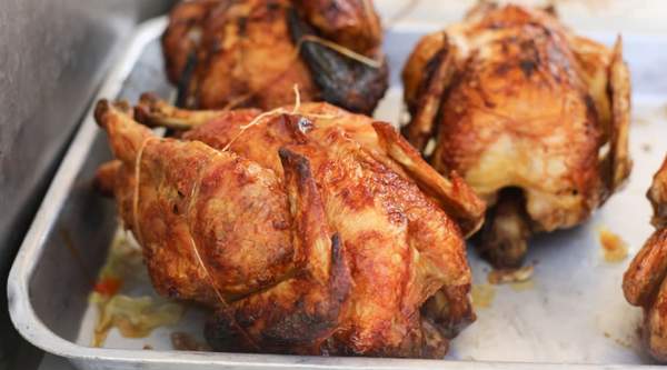 Pollo asado jugoso y caliente con salsita de vino blanco, y mas ingredietes del chef