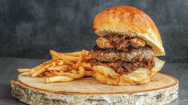 Pan brioche casero, carne de pollo, foie gras, queso gorgonzola y cebolla caramelizada, acompañado de patatas fritas caseras