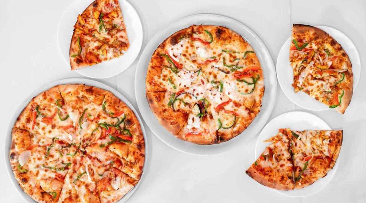 Tomate, mozzarella, pollo Tikka, pimiento verde, pimiento rojo, cebolla, olivas negras.