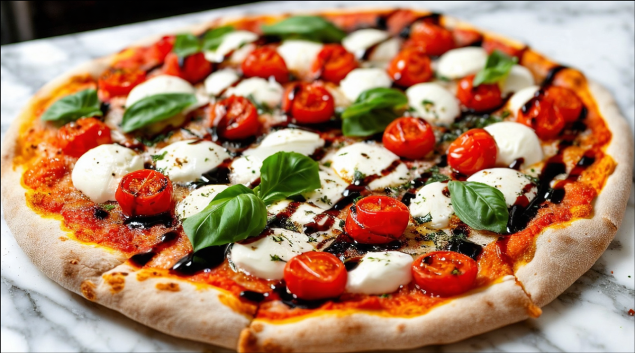 Tomate natural 100 %, mozzarella italiana , pimientos escalivados, calabacín,rodajas de tomate fresco, pesto italiano, cebolla cruda y Granna Padano