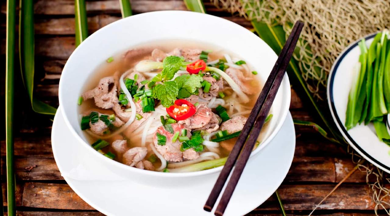 Tallarines de arroz salteados con pato, cebolla y brócoli