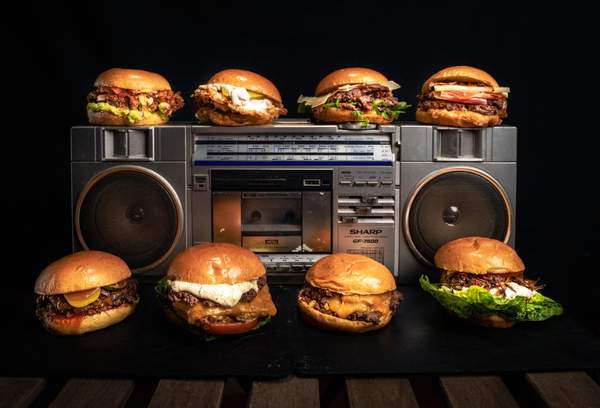 Doble Smash Burger de vacuno madurado 60 días con pastrami de cabecero de lomo (receta de Antonio), canónigos aliñados en miel y mostaza, queso Comte 24 meses y Alioli de ajos asados