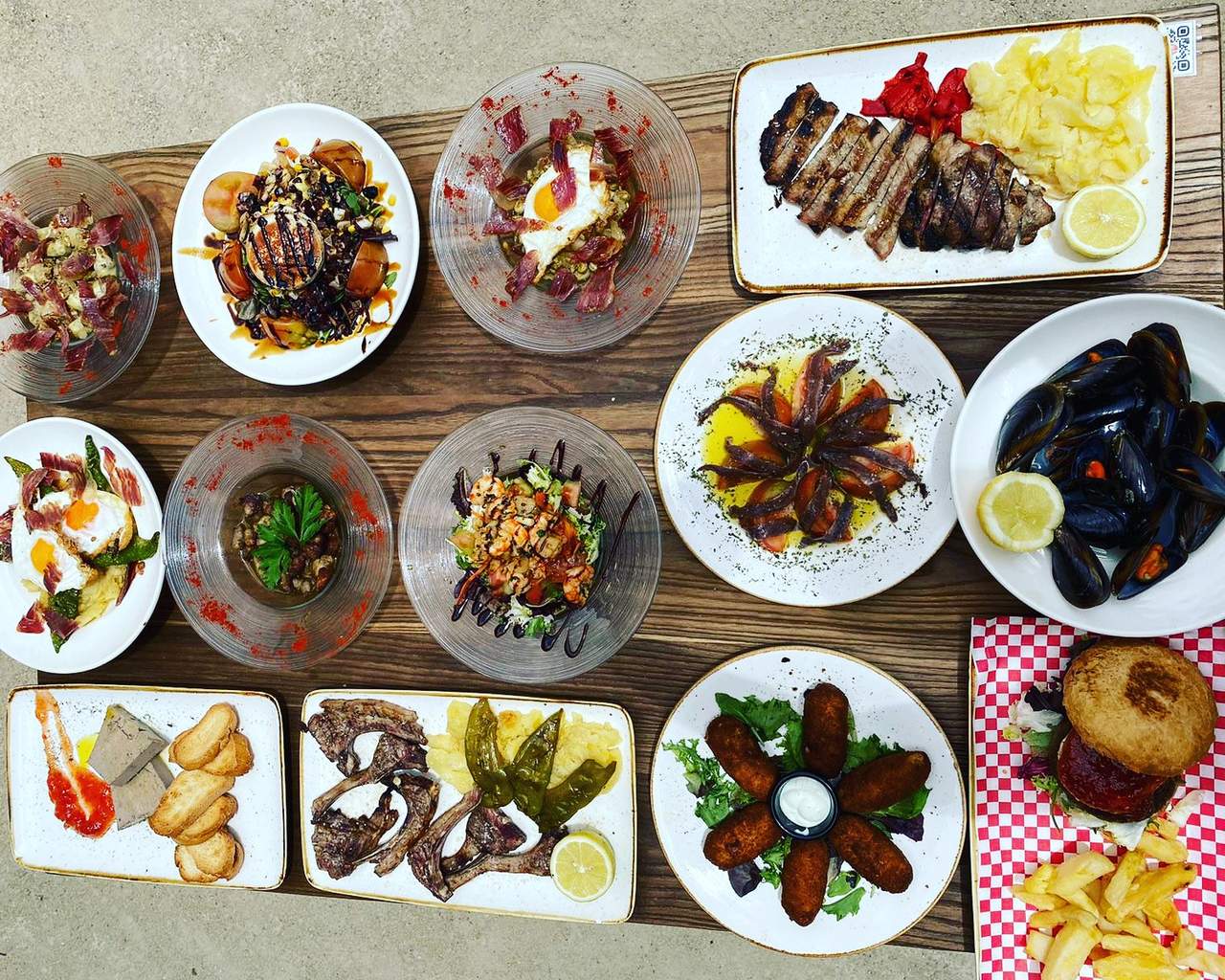 Queso añejo de oveja y cabra, jamón gran reserva, bacalao y mojama de primera, pan tostado, cazuela de aceite de oliva virgen extra, tomate y ajo