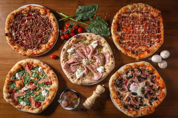 Salsa de tomàquet, mozzarella, anxoves, salmó, bacó carxofes i olives
