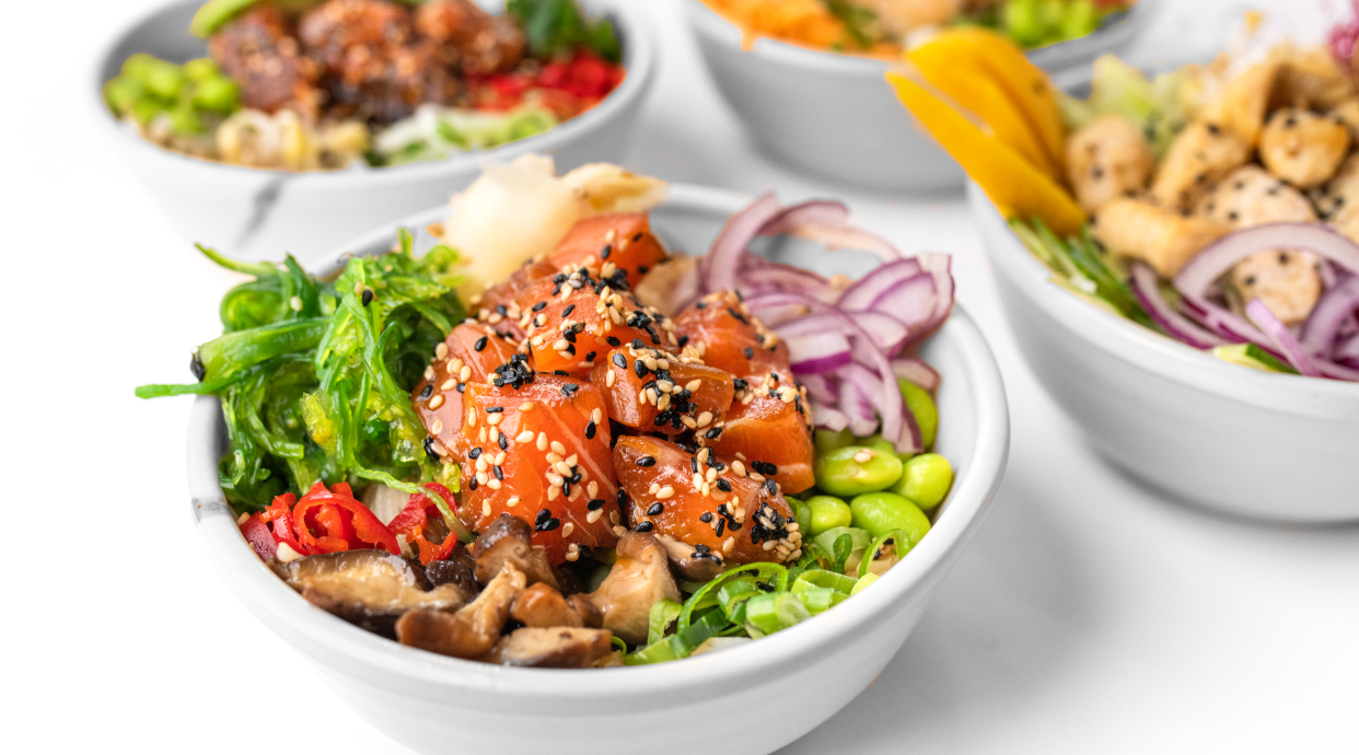 Salmón crudo, habas de soja, mango, aguacate, cebolla tierna, wakame, cebolla caramelizada, arroz vinagrado, cebollino, salsa poke y masago