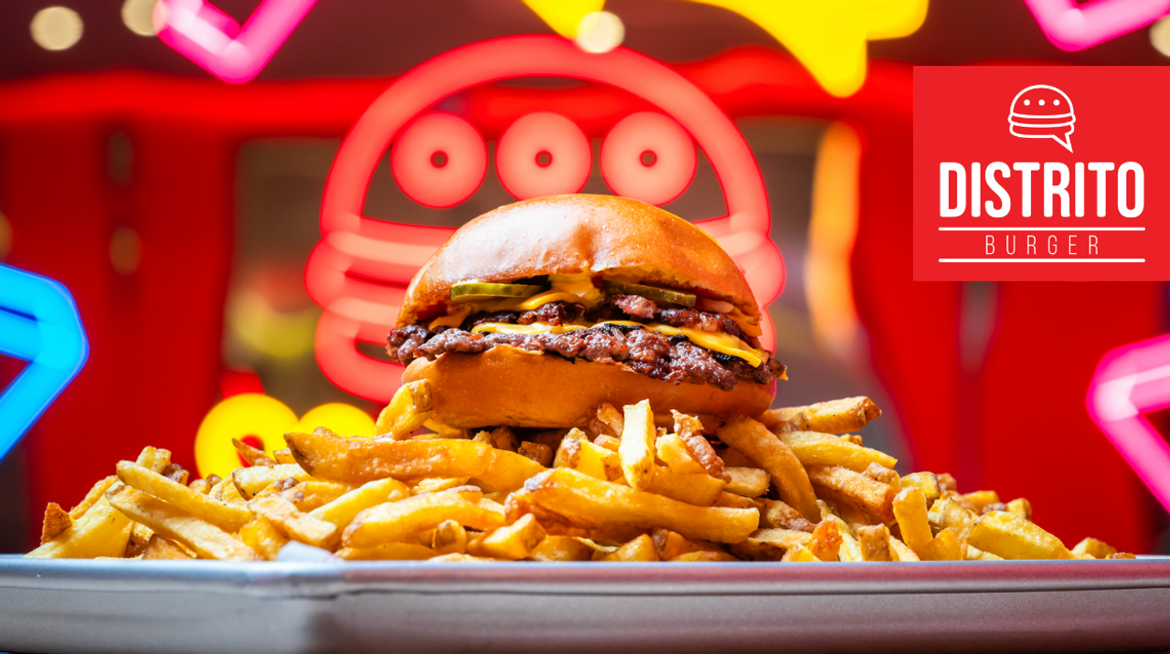 Doble carne smash, doble queso americano, cebolla crunchy, bacon, salsa Distrito en Bun tostado y suave a la vez