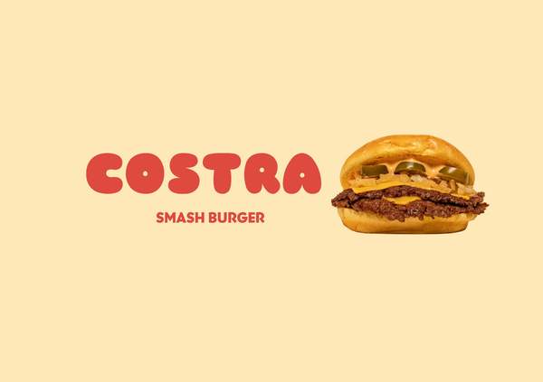 Doble Smash Burger, queso americano, pepinillos, cebolla a la plancha y salsa Costra. Todas nuestras burgers se montan con un delicioso pan brioche. Alergenos: Gluten, Huevo, Lacteos, Mostaza.
