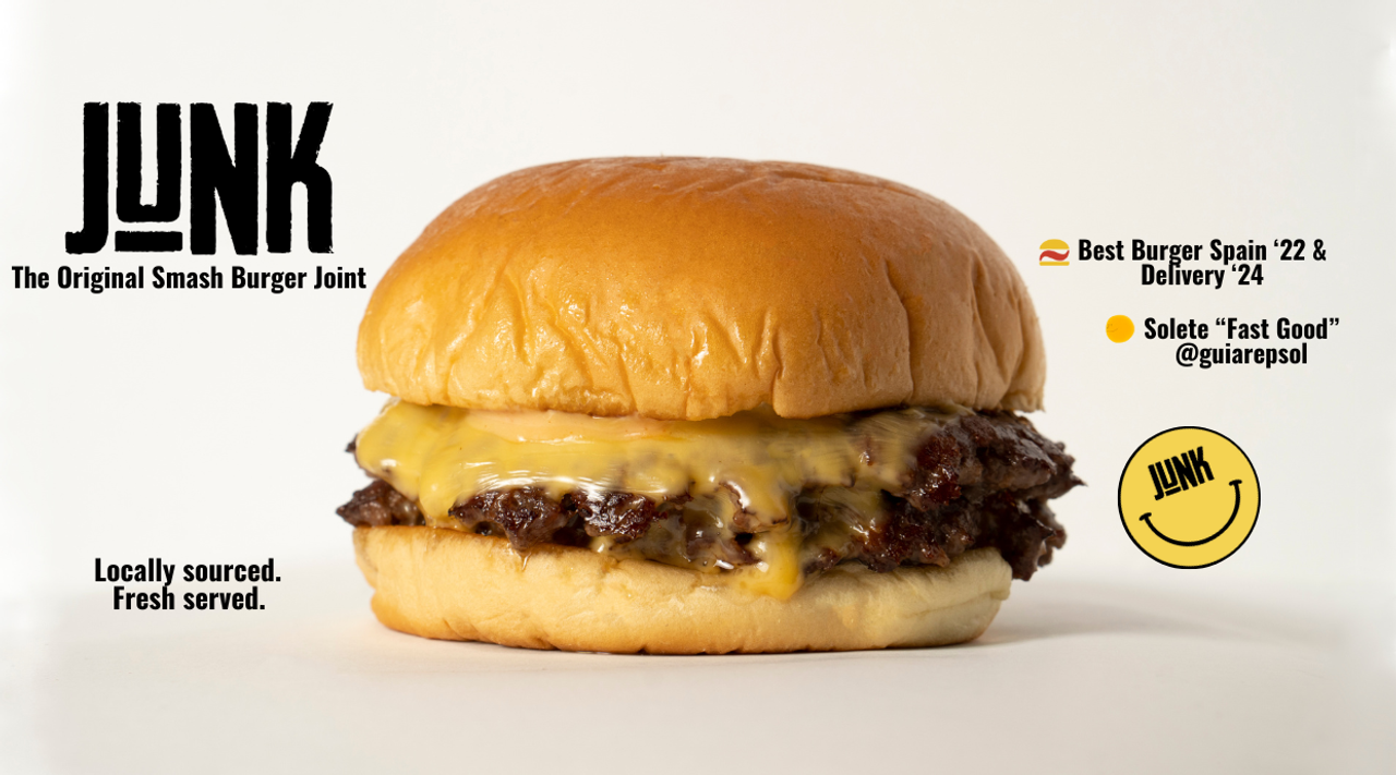 LA MEJOR HAMBURGUESA DE ESPAÑA 2022. Doble Smash Burger de vaca avileña. Acompañada de queso cheddar y crujiente bacon ahumado. Salsa secreta. Envuelta en nuestro pan brioche con pepitas.