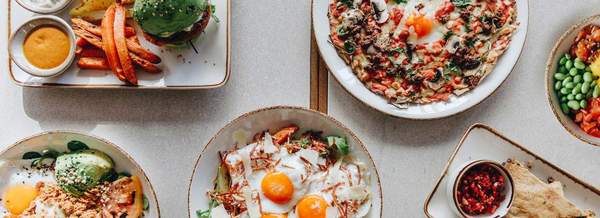 Ensalada estilo cowboy con mango, aguacate, huevo duro, tomates cherry, cebolla morada, maíz y nuestro aliño de jengibre.