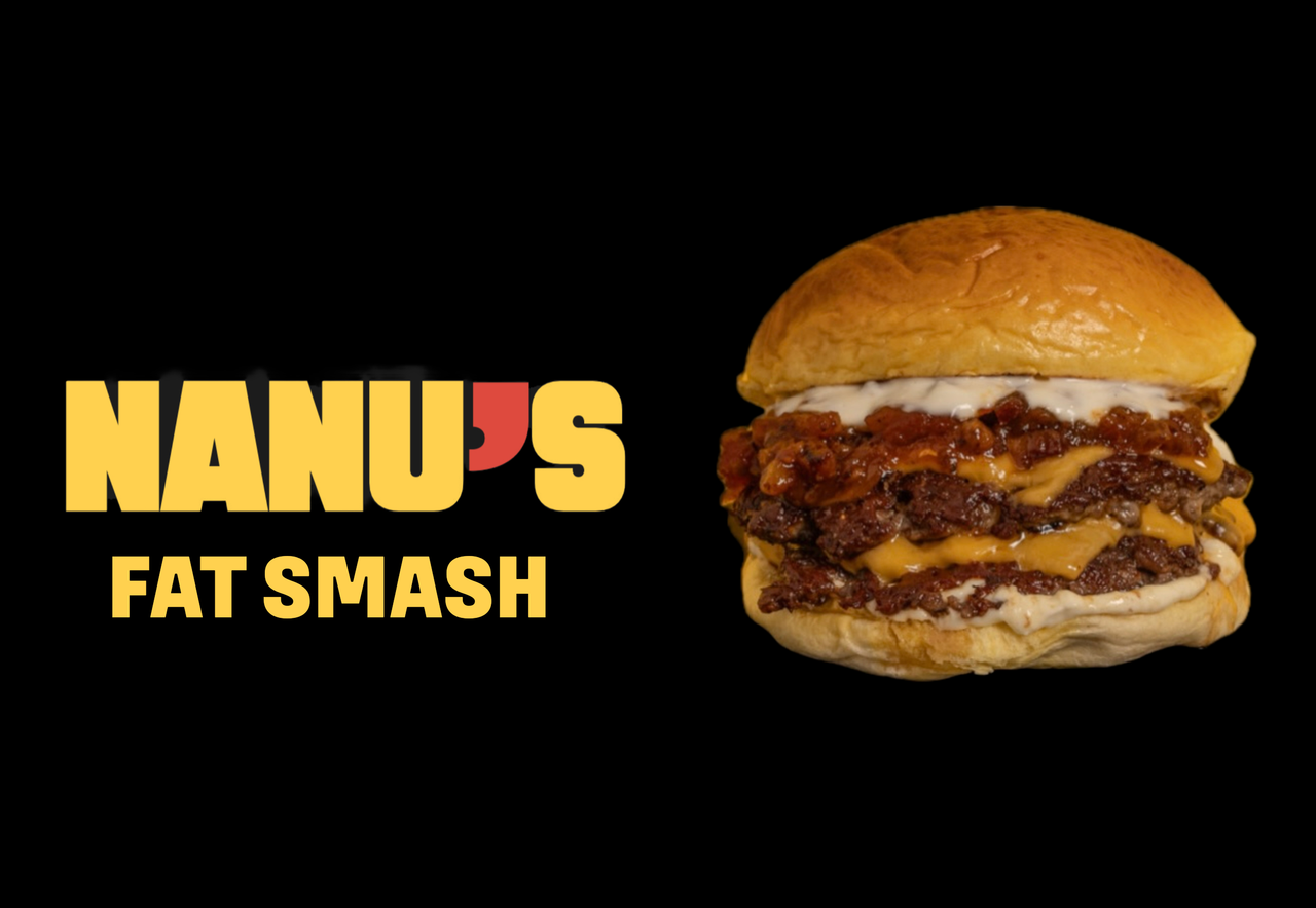 FAT SMASH, QUESO AMERICANO, BACON, LECHUGA, TOMATE, CEBOLLITA, PEPINILLOS Y SALSA NANU´S