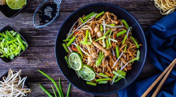 Fideos yakisoba salteados mezclados con verduras y pollo