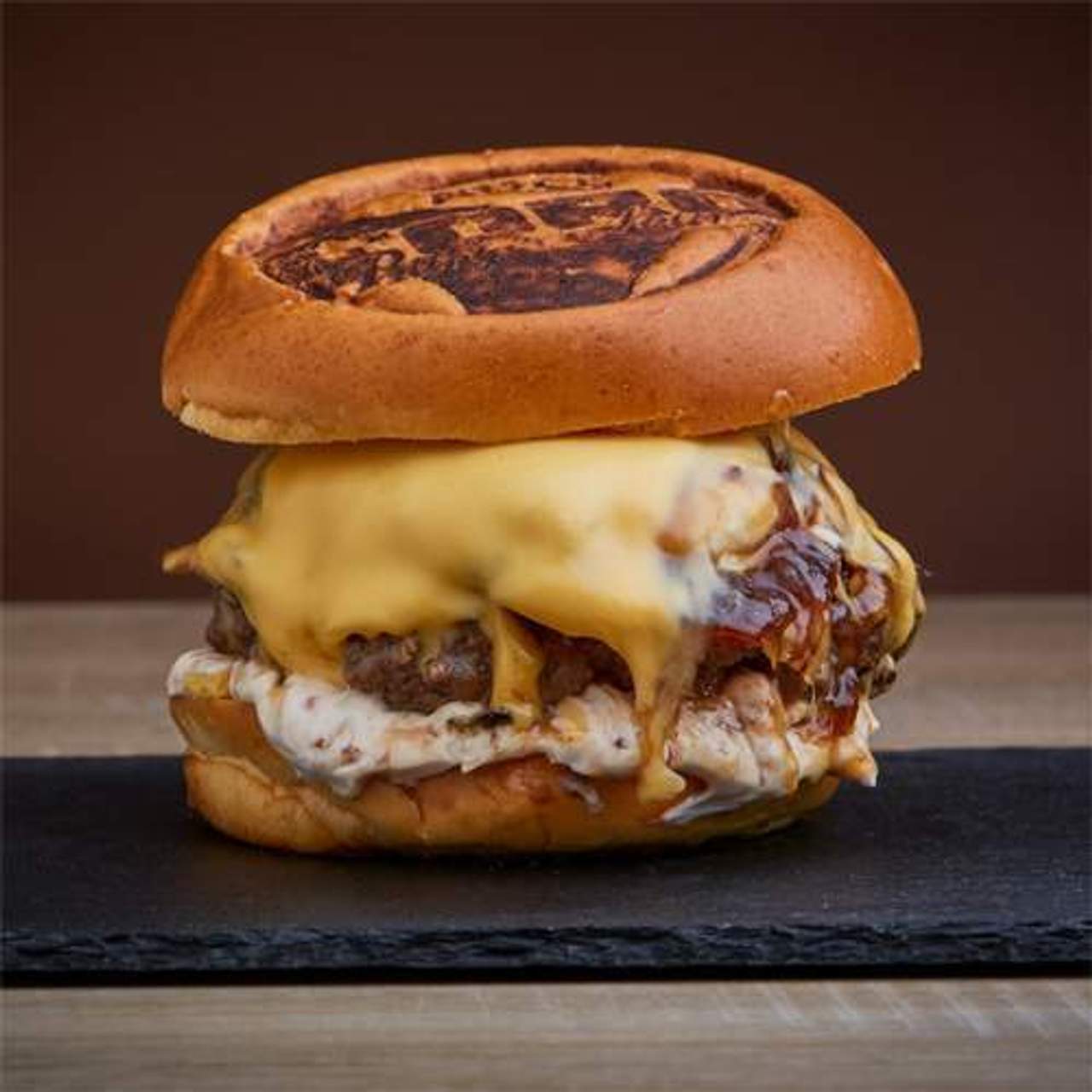 Pan brioche, baconesa, cebolla morada cruda, doble bacon, salsa de queso y doble cheddar fundido con cava.