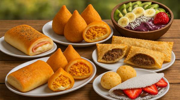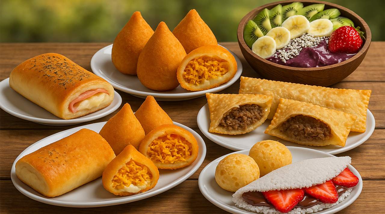 Una deliciosa selección de bocadillos tradicionales brasileños, fritos y horneados, perfectos para compartir.