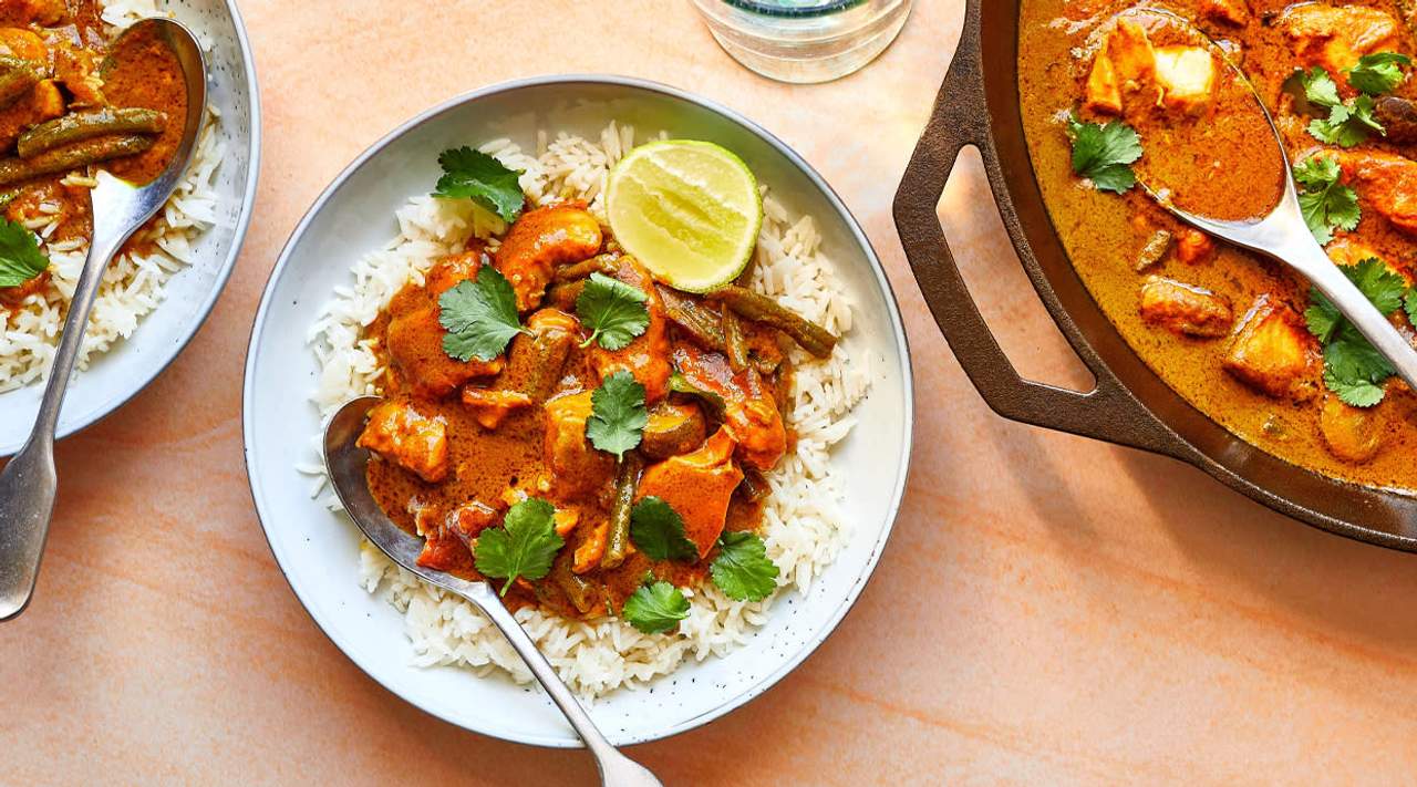 Pollo cocinado en una salsa suave a base de tomate y cebolla con curry y especias aromáticas. Acompañado de arroz basmati.