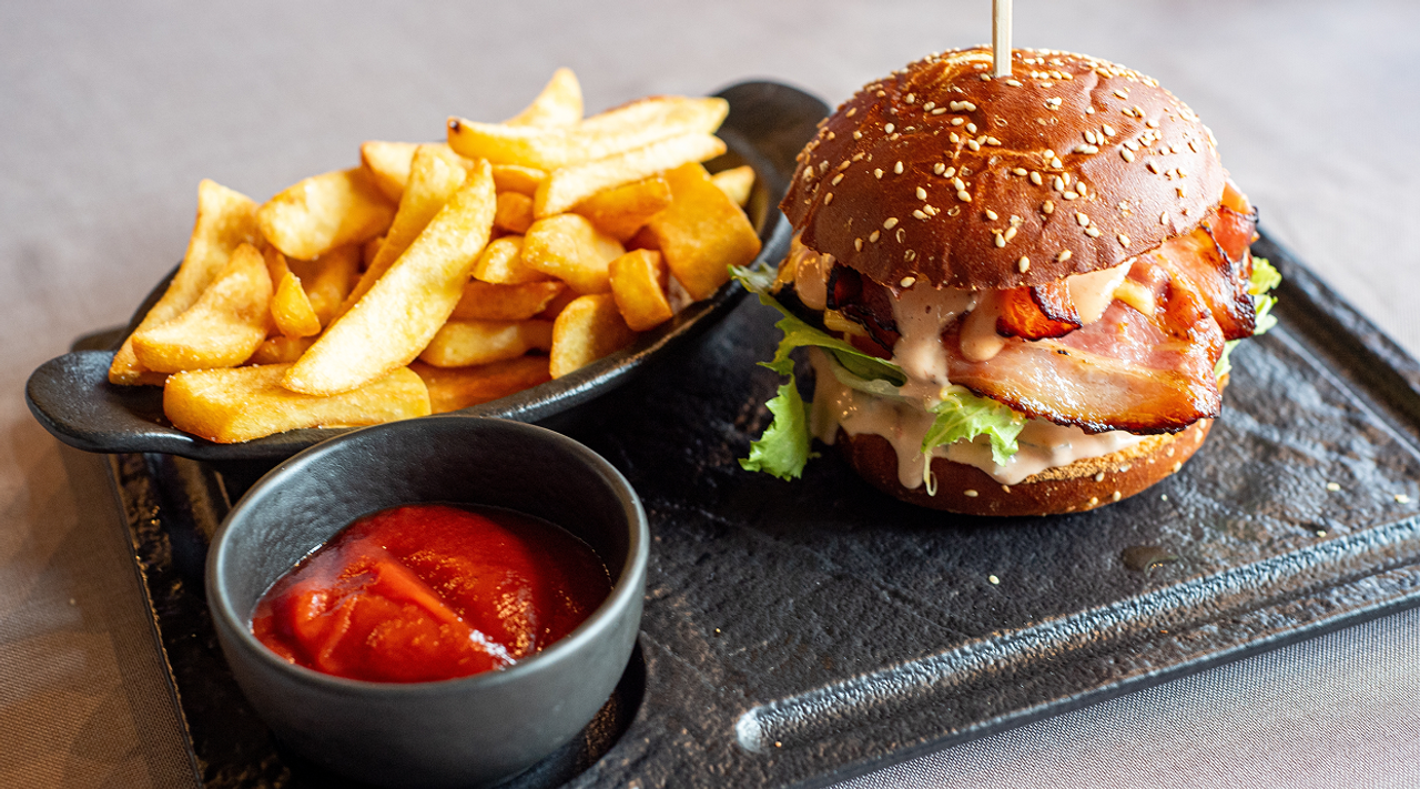 Filete de heura acompañado de tomate, pepinillos, lechuga, cebolla y Vacon, aderezada con nuestra salsa rosa espaciada y un toque de mostaza. Con patatas fritas