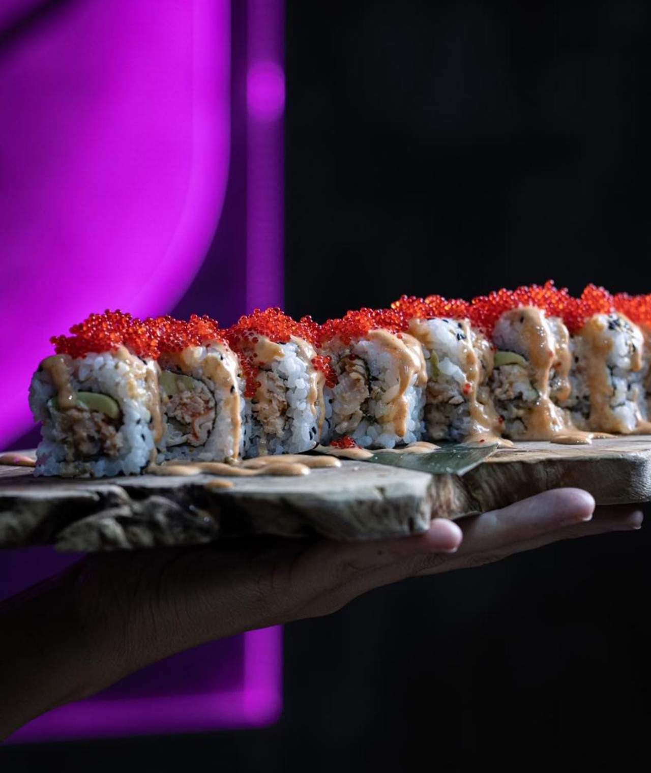 Roll de sushi relleno de ensalada kanikama, queso crema y aguacate, cubierto con tobiko rojo y una salsa spicy