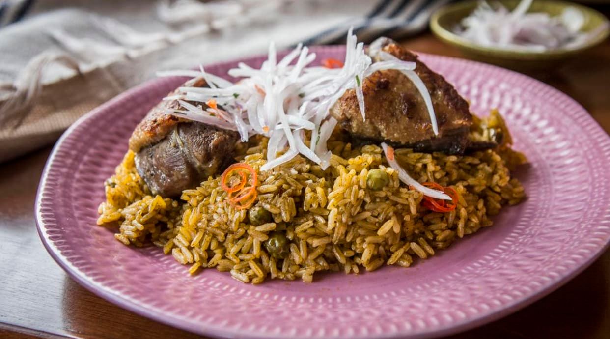 Arroz chaufa con lomo saltado y patatas fritas.