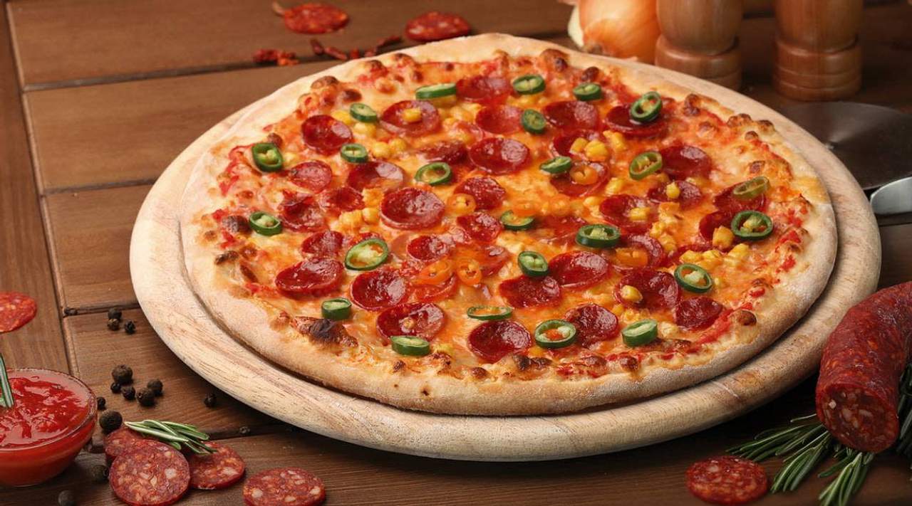 Base, champiñón, cebolla asada, pimiento y aceitunas negras