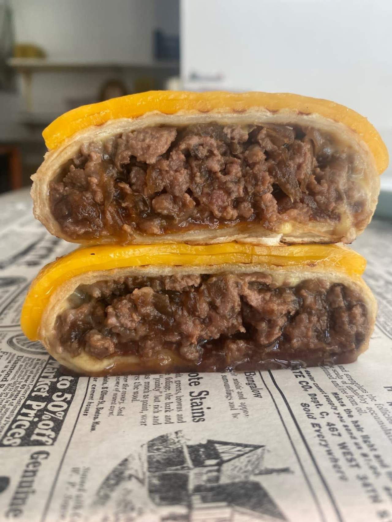 Dos tortillas de trigo de 25 cm de máxima calidad, cremoso queso Cheddar, carne de vaca Luismi,relish de pepinillo casero,un toque de mostaza dulce,y un toque de ketchup casero