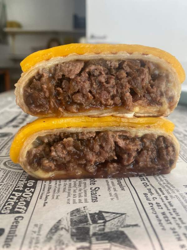 Doble tortilla de trigo de calidad premium,queso Raclette curado,carne de vaca Luismi,cebolla caramelizada,bacon ahumado en madera de manzano,y la nueva Salsa BBQ Koreana