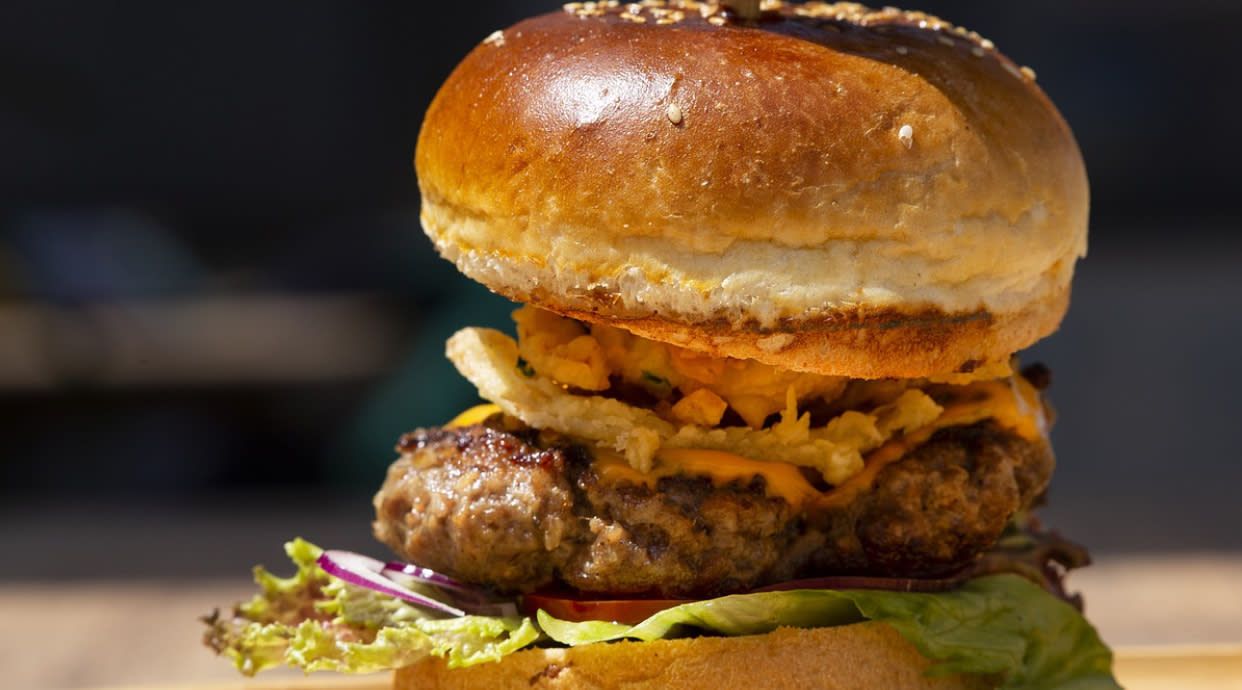 Bollo de pan, carne de ternera 100 %, bacón, lechuga, tomate, queso y cebolla confitada