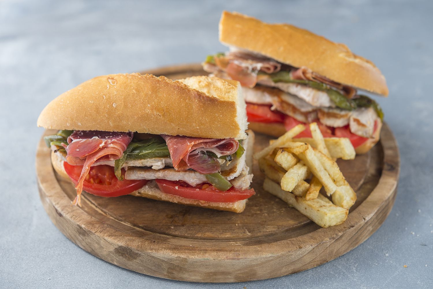 Solomilllo al whisky, jamón serrano, tomate, pimiento fritos y patatas fritas. En pan de mollete.