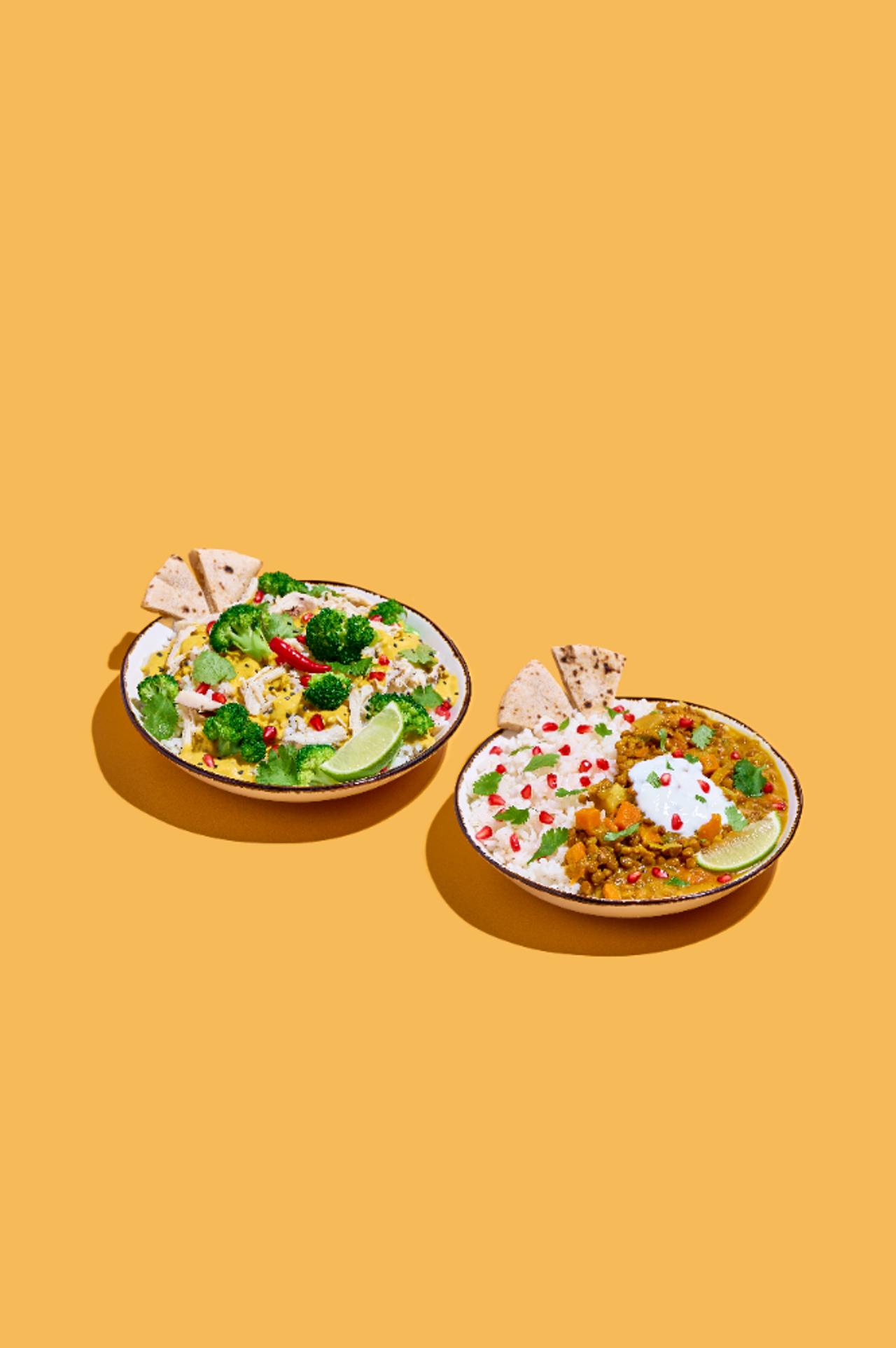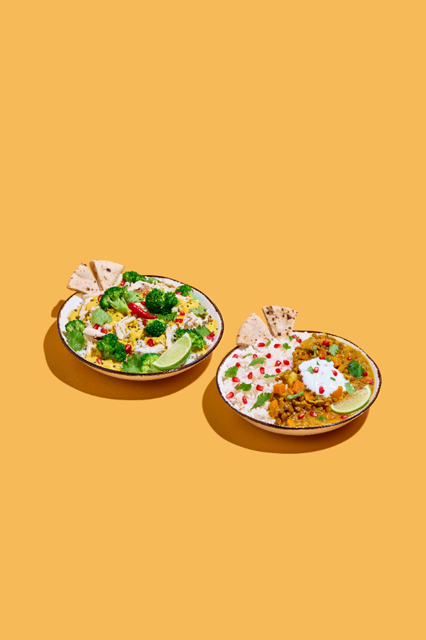 Arroz, pollo de corral, brócoli, salsa curry, granada, cilantro, chile y limón acompañado de pan pita.