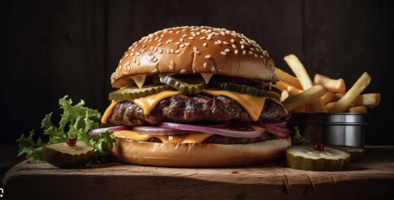 Beyond meat, formatge cheddar, salsa de cogombre, ceba caramelitzada