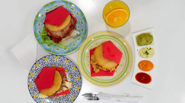 Arepas (2 uds.), salsas (2 uds.), refresco (2 ud.)