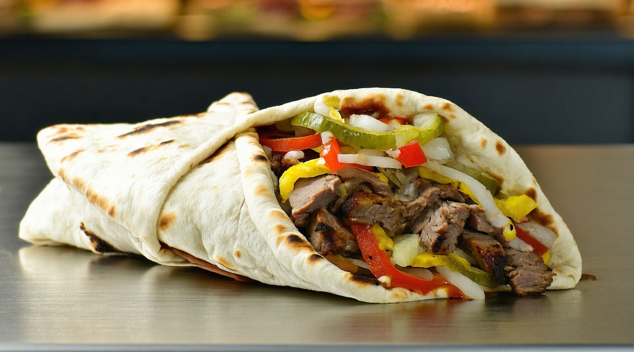 Igual que el kebab de carne, pero envuelto en pan tipo tortilla (más grande y manejable). Ternera o pollo a elegir